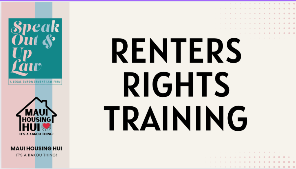 This week the Maui Housing Hui held a renter’s rights training at the Cameron Center. The event aimed to empower renters by providing them with comprehensive information on their rights and responsibilities. In collaboration with Speak Out and Up Law, this social justice initiative training session covered a wide range of topics, including landlord-tenant law, lease agreements, eviction procedures, and fair housing practices. By shedding light on the nuances of the legal framework, our goal was to equip renters with the knowledge and tools necessary to navigate housing issues effectively. The partnership with Speak Out and Up Law ensured that attendees received expert guidance and practical advice tailored to their specific needs. Through these efforts, we aimed to foster a community where renters are well-informed and empowered to advocate for their rights.